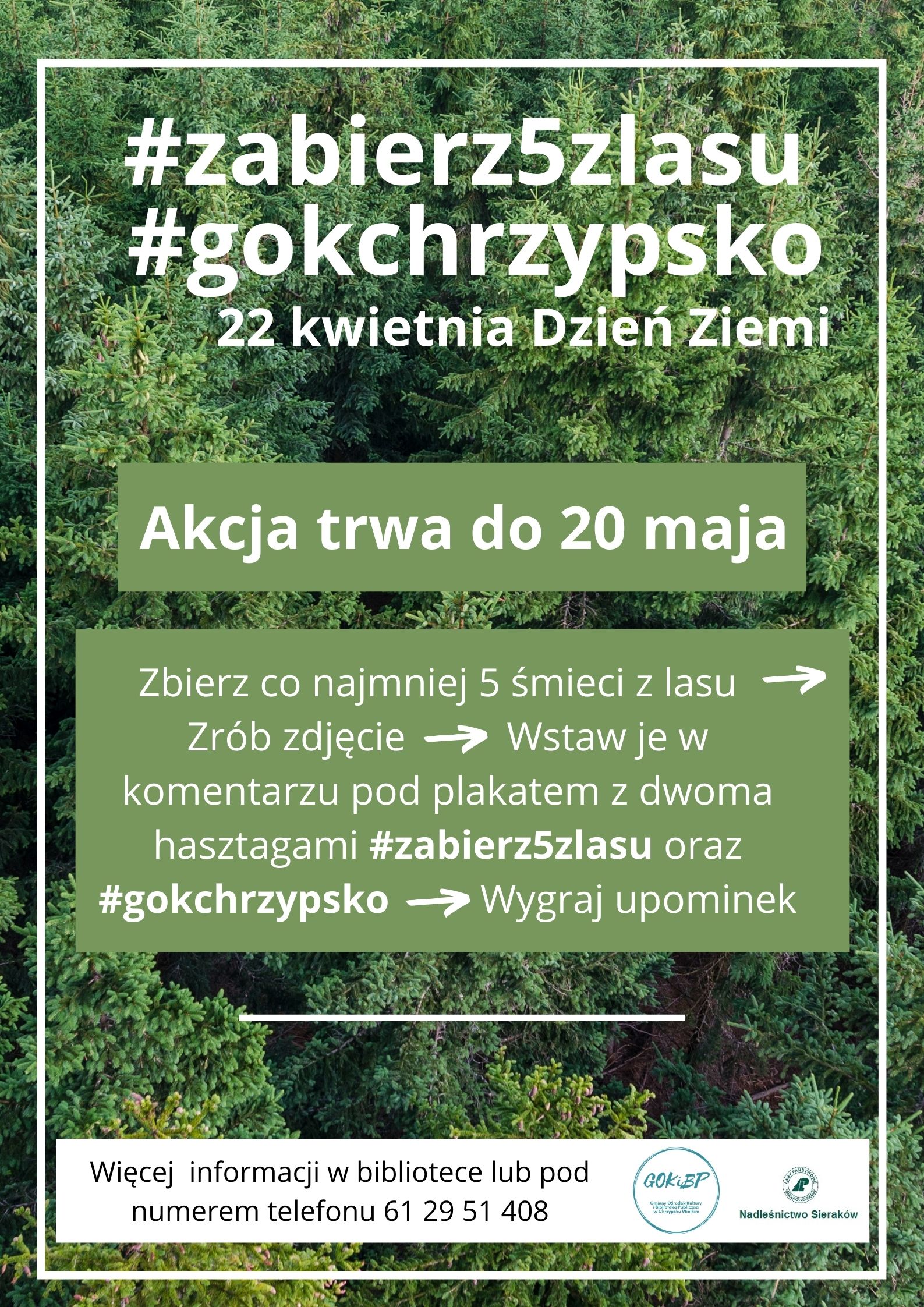 Zbliża się Dzień Ziemi. Z tej okazji, wraz z Nadleśnictwo Sieraków, Lasy Państwowe, zapraszamy do udziału w akcji #zabierz5zlasu. Wśród osób, które wstawią zdjęcie z hasztagami #zabierz5zlasu i #gokchrzypsko na Facebooku, rozlosujemy nagrody-niespodzianki. To kto zagra z nami w zielone? :)