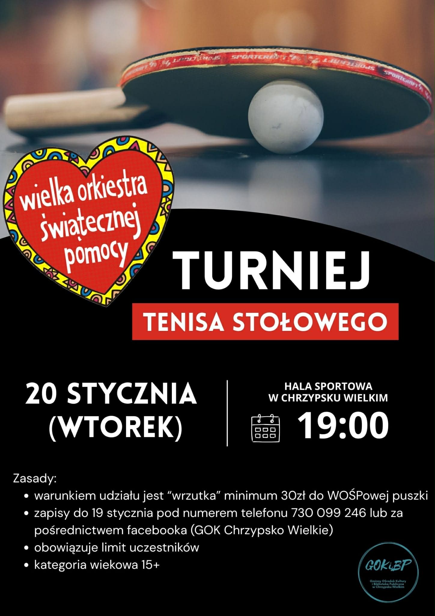 Turniej odbędzie się 20 stycznia (wtorek) o godzinie 19:00 w Hali Sportowej w Chrzypsku Wielkim. Warunkiem udziału jest wrzutka minimum 30 zł do WOŚP-owej puszki, obowiązuje limit uczestników oraz kategoria wiekowa 15+. Zapisy przyjmujemy do 19 stycznia pod numerem telefonu 730 099 246 lub za pośrednictwem Facebooka (GOK Chrzypsko Wielkie). W załączeniu regulaminy oraz zgody. Gramy razem i pomagamy – do zobaczenia przy stole! ????❤️